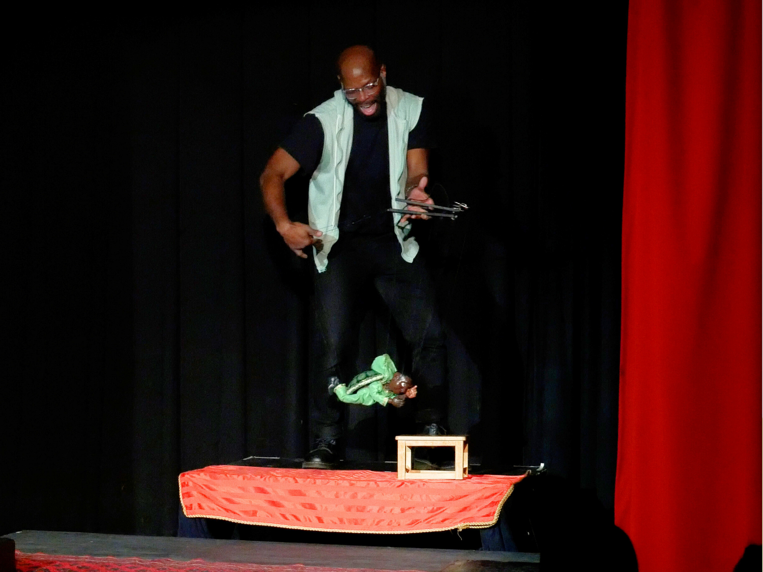 As Uncle Josue leaves to take a nap, he tells Emmanuel to “tell that story you made up; I like that story!” and Emmanuel finds himself on stage alone. He reminisces about how much he loved reading comic books about action heroes as a kid, before segueing into his own action story — a choose-your-own-adventure about Turtle Boy, the marionette he built in the Creative Residency.